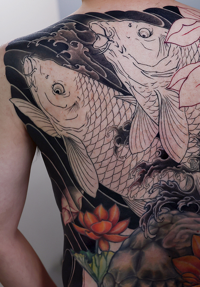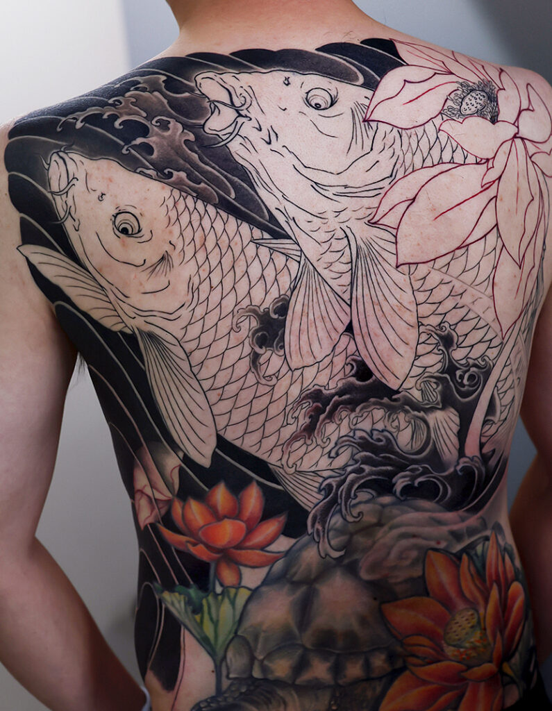 2025.12.16 鯉 蓮 背中一面 タッチアップ 和彫り 額の施術が進み、二匹の鯉の動きが引き立ってきました。格好良いですね。 下部と、うまい具合に一体感を持たせていきたいと思います。 お疲れ様でした。ひきつづき頑張っていきましょう。 制作事例 関連する記事 菊水 腕十分袖 和彫り 2026.01.07 八岐大蛇 ヤマタノオロチ 腕十分袖 和彫り 2025.12.23 一匹龍 腕十分袖 和彫り 2025.12.23
