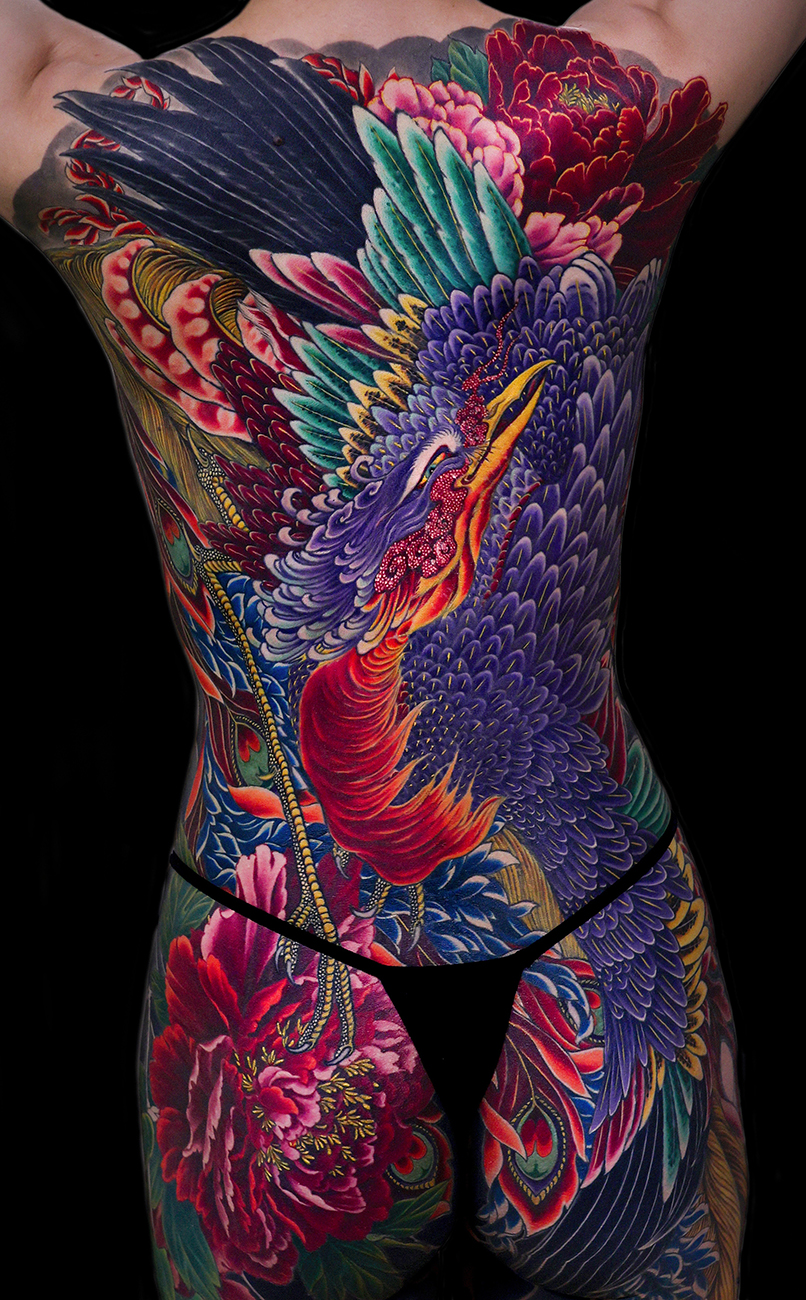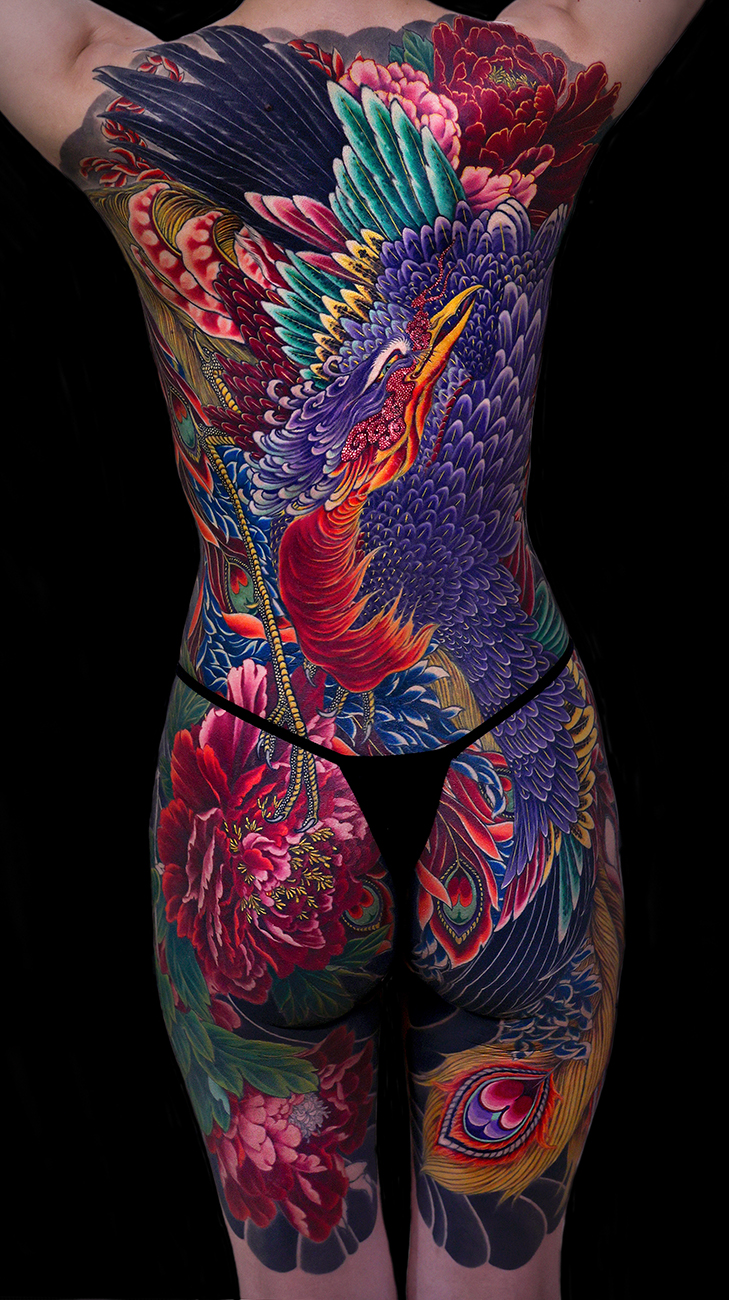 刺青のカラーは基本的に細かくなればなるほど少しの色抜け飛びが全体の雰囲気をくずしてしまいがちで、施術後のケアも非常に気を使います。また彫師側も多色を使いグラデーションを豊富に使うと馴染んだ時のカラーの出方などを常に考慮して進めていかなければなりません。