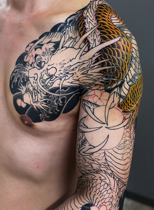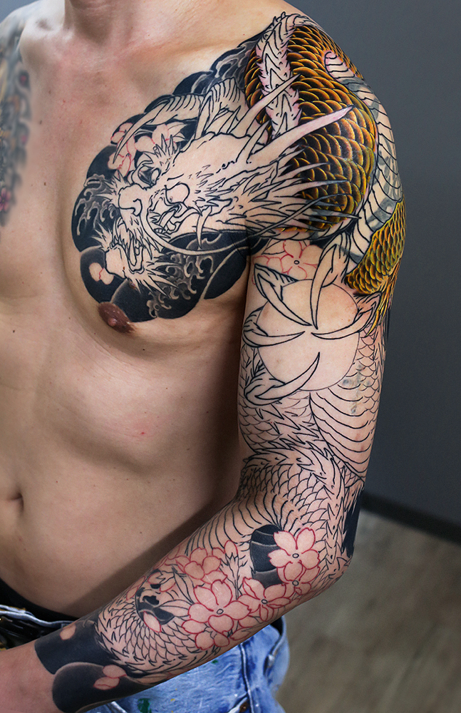 カバー部分を少し彫り、龍のカラーメインの施術でした。