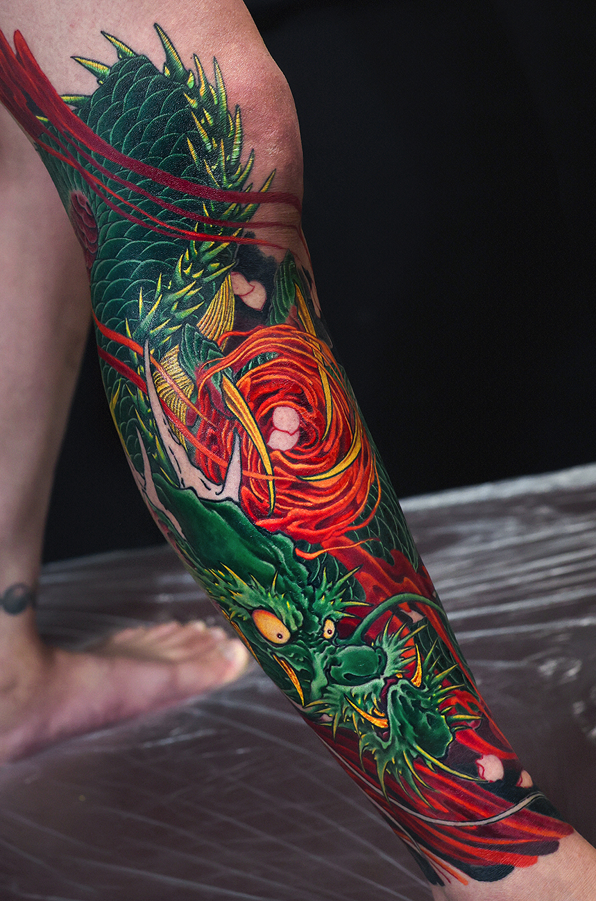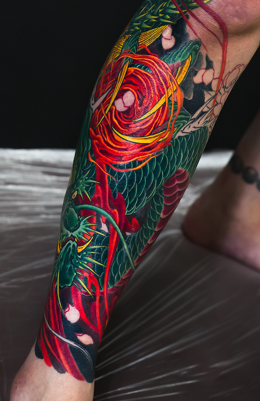 2026.03.10 龍 桜 ふくらはぎ脚 和彫り 徐々に形づいてきました。龍の存在感や迫力があり格好良いです。 お疲れ様でした。 制作事例 関連する記事 猛虎 菊 背中一面 和彫り 2026.03.10 須佐之男命 ヤマタノオロチ退治 和彫り 2026.03.10 蛇 桜 腕十分袖 和彫り 2026.03.10
