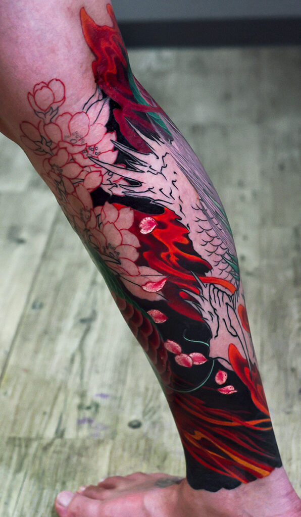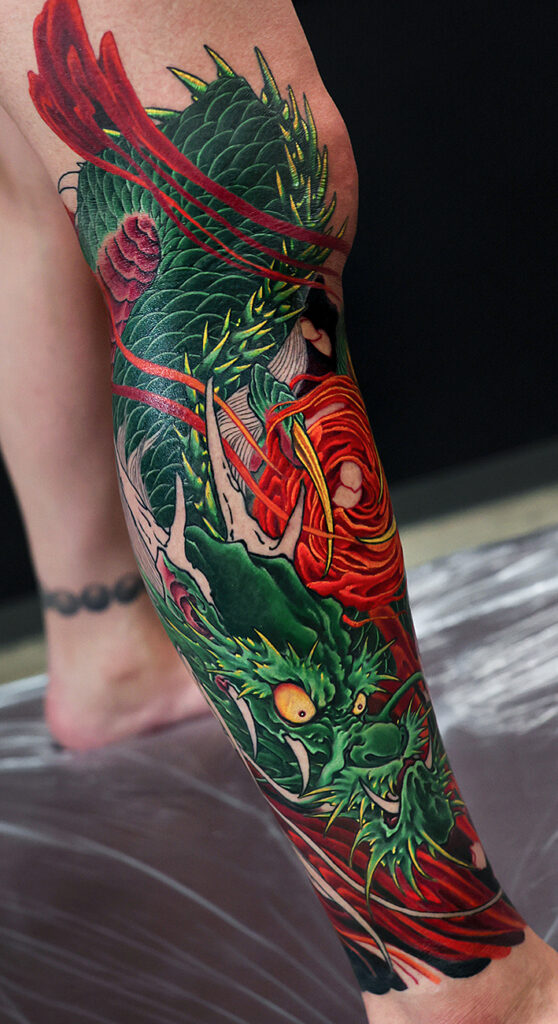 2025.12.16 龍と桜 ふくらはぎ 和彫り 炎の玉にカラーが入りました。 まだ腫れていますが落ち着くと良い感じになると思います。 内側は桜と炎が入っています。 脚のふくらはぎでも一周を覆っている刺青とそうでないものでは、刺青そのものの存在感がやはり違いますね。迫力があります。 次回コンディションのほうよろしくです。 お疲れ様でした。 制作事例 関連する記事 菊水 腕十分袖 和彫り 2026.01.07 八岐大蛇 ヤマタノオロチ 腕十分袖 和彫り 2025.12.23 一匹龍 腕十分袖 和彫り 2025.12.23